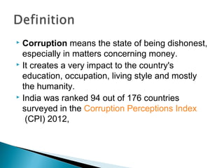 Corruption undermines a country's development by impacting education, employment, living standards, and humanity. India ranks 94th out of 176 countries on corruption according to a 2012 index. Corruption occurs through political, administrative, and professional channels and leads to a lack of proper systems, economic stability, and effective leadership. It results in a loss of national wealth and hinders development. Solutions include promoting value education, transparency, strict legislation, and effective vigilance. Several major corruption scandals have occurred in India such as the 2G spectrum scam and Commonwealth Games scandal. The Prevention of Corruption Act of 1988 aims to curb corruption by punishing public officials through fines and imprisonment.