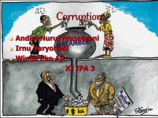 This document discusses corruption in Indian society. It defines corruption as wrongdoing by those in power through illegitimate or unethical means, often involving bribery. Common forms of corruption include bribery, embezzlement, extortion, abuse of power, nepotism, and improper political contributions. Globalization has increased opportunities for corruption but also for curbing it. The media and independent anti-corruption agencies can play important roles in increasing transparency and accountability. Suggested solutions include implementing anti-corruption laws, establishing anti-corruption police and courts, social awareness campaigns, and encouraging individual responsibility and leadership to reduce corruption in India over time.
