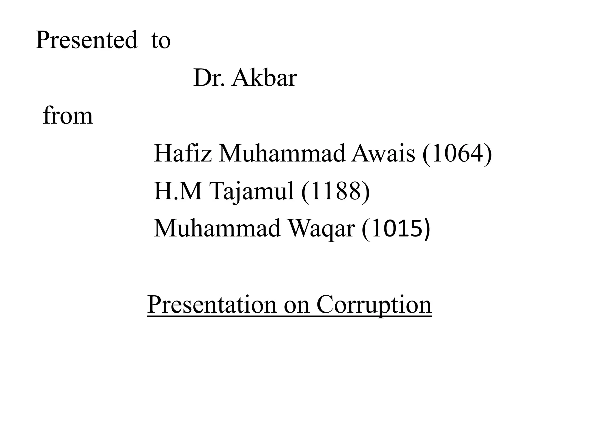 The document presents information on corruption in Pakistan, discussing its historical roots and various forms and causes. It summarizes that corruption was inherited from the British feudal system and increased tax burdens on citizens. Corruption exists at both macro and micro levels and affects sectors like police, judiciary, power, tax, health, education, and land administration. Common forms of corruption include bribery, nepotism, fraud, and embezzlement. Causes include selfishness, lack of education, unequal implementation of religious rules, inequality, unemployment, and dissatisfaction. Overcoming corruption requires individual reflection, public awareness campaigns, reforms at lower levels of government, improved education, and involvement of media and religious leaders.