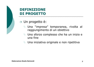 Il documento descrive le definizioni e gli scopi del project management, sottolineando l'importanza della pianificazione e del controllo per raggiungere gli obiettivi nei tempi e nei costi previsti. Vengono analizzate le fasi chiave del project management e l'utilizzo di Microsoft Project, evidenziando le sue funzioni principali. Microsoft Project offre strumenti per la gestione efficiente di progetti complessi, tra cui la creazione di report personalizzati e l'utilizzo di diagrammi di Gantt per il monitoraggio delle attività.