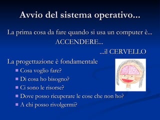 Il documento fornisce informazioni sulle strategie e gli strumenti di progettazione informatica, con particolare attenzione alla gestione dei dati, all'uso di supporti ottici e all'organizzazione delle cartelle. Viene discussa l'importanza di mantenere il computer e i supporti di memorizzazione in buono stato e come utilizzare efficacemente software per la manipolazione delle immagini e la fotografia. Inoltre, il documento affronta aspetti tecnici come la qualità delle immagini e il rispetto del copyright nella ricerca di foto online.