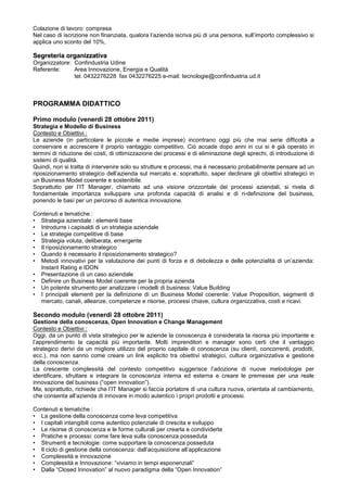 Il corso di formazione per IT manager si svolge dal 28 ottobre all'11 novembre 2011 e mira a riportare le aziende sul sentiero della competitività attraverso innovazione e strategie efficaci. Destinato a manager consapevoli del loro ruolo, il programma prevede moduli pratici su tematiche come la gestione della conoscenza, il project management e l'ottimizzazione dei processi, culminando in un project work adattato alle esigenze aziendali. Gli esperti coinvolti offriranno supporto nella definizione di progetti concreti per affrontare le sfide del mercato.