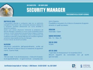 Il documento descrive un corso di formazione per diventare 'security manager', obbligatorio dal 16 settembre 2012 per gli istituti di vigilanza privati. Il corso, della durata di 100 ore, è tenuto da docenti accreditati e prevede esami periodici e un attestato finale per i partecipanti che superano il test. È previsto un costo di 1.900€ e le iscrizioni devono essere confermate almeno 10 giorni prima dell'inizio del corso.