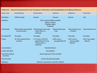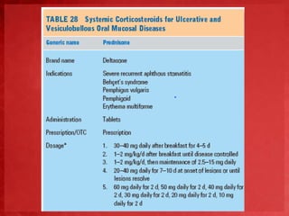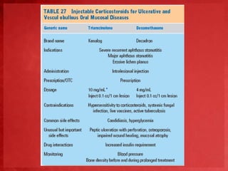 This document discusses corticosteroids, highlighting their importance in regulating metabolism, water balance, and stress responses. It covers their biosynthesis, mechanisms of action, clinical uses in medicine and dentistry, and the potential adverse effects associated with their use. The document also details specific steroid classifications and treatment protocols for various medical conditions, particularly in oral and systemic applications.