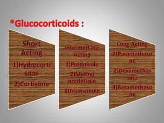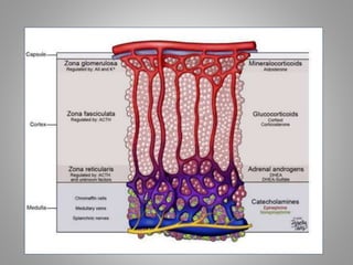 Corticosteroids are a class of steroid hormones produced in the adrenal cortex that are involved in many physiological systems such as the stress response, immune response, regulation of inflammation, carbohydrate and protein metabolism, electrolyte levels, and behavior. Corticosteroids are produced in three zones of the adrenal cortex - the zona fasciculata, zona glomerulosa, and zona reticularis - and include glucocorticoids, mineralocorticoids, and androgens such as deoxycorticosterone acetate, fludrocortisone, and aldosterone. Corticosteroids act by binding to receptors in cell membranes and forming complexes that enter the nucleus and affect
