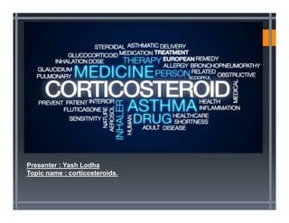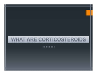 Corticosteroids are a class of steroid hormones that are produced in the adrenal cortex or synthesized. They are involved in processes like stress response and inflammation regulation. The two main classes are glucocorticoids like cortisol and mineralocorticoids like aldosterone. Corticosteroids have anti-inflammatory, immunosuppressive and other effects. They act by binding to glucocorticoid or mineralocorticoid receptors. While corticosteroids can provide benefits for conditions like inflammation, their use also has numerous potential adverse side effects affecting multiple body systems if used long-term or in high doses.