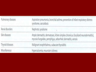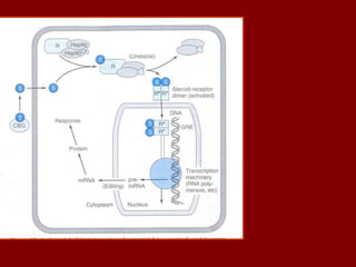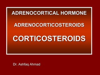 This document discusses adrenocortical hormones and corticosteroids. It begins by describing how corticosteroids are derived from cholesterol and the different zones of the adrenal cortex that produce glucocorticoids, mineralocorticoids, and androgens. It then covers the mechanisms of action of glucocorticoids like cortisol via glucocorticoid receptors, their therapeutic uses to treat inflammatory and autoimmune disorders, and their potential side effects. The document also discusses mineralocorticoids like aldosterone, their effects on sodium reabsorption, and synthetic alternatives like fludrocortisone. Inhibitors of corticosteroid synthesis and antagonists of mineralocorticoid receptors