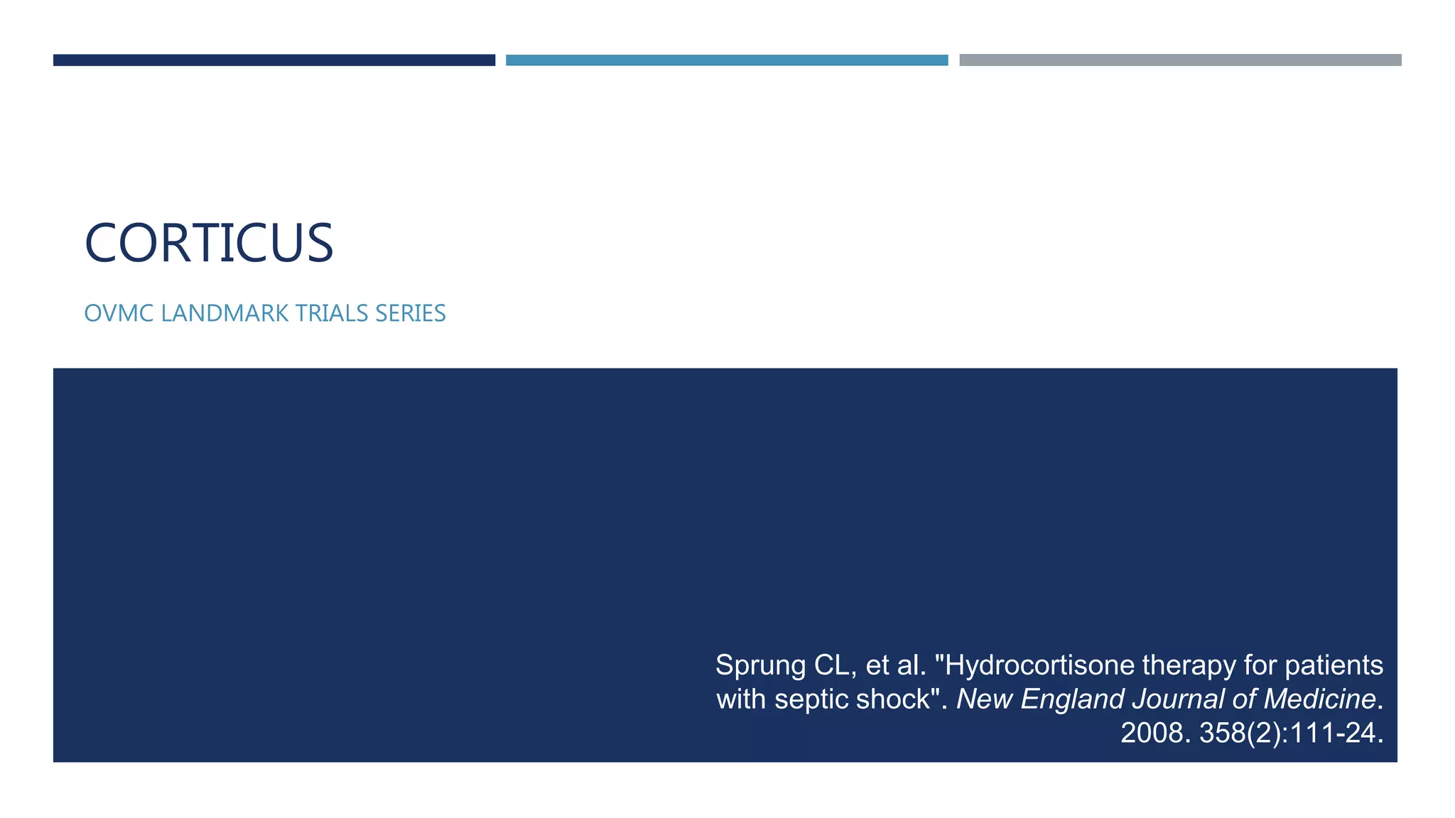 The CORTICUS trial investigated whether low-dose hydrocortisone therapy improves survival in critically ill patients with septic shock. The trial randomized 499 patients with septic shock to receive hydrocortisone or placebo. It found that hydrocortisone hastened the reversal of shock in patients whose shock was reversed, but did not confer an overall survival benefit. Based on this trial and others, corticosteroids should not be routinely used in adult patients with septic shock, though they may benefit selected patients.