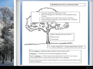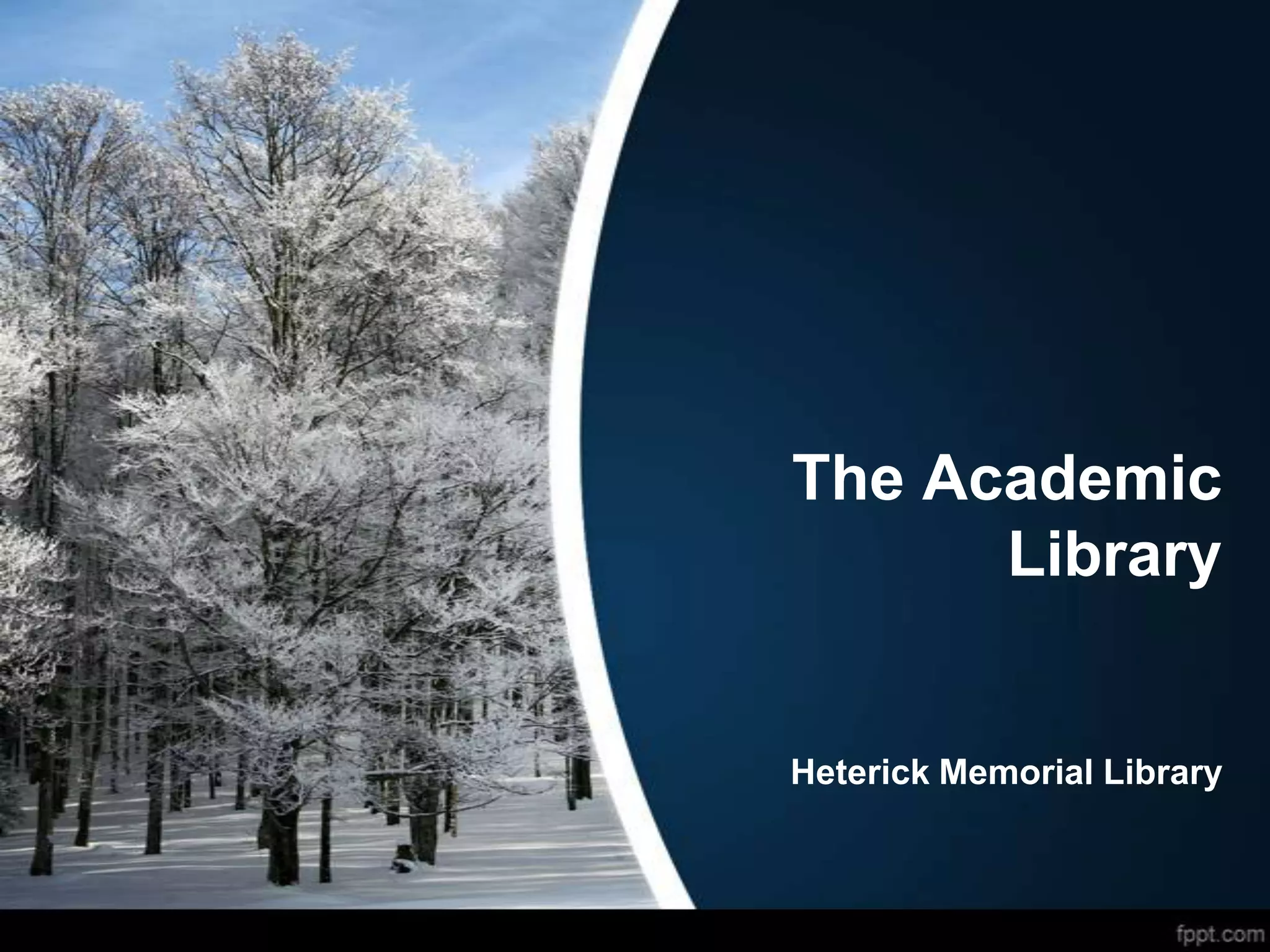 The document discusses the differences between academic and public libraries, noting that academic libraries focus on teaching students to conduct their own research, while public librarians often find information for patrons. It then provides an overview of the research process in academic libraries, outlining the 7 steps from identifying a topic to citing sources, and includes tips on developing search strategies, evaluating websites and using the library catalog and databases.