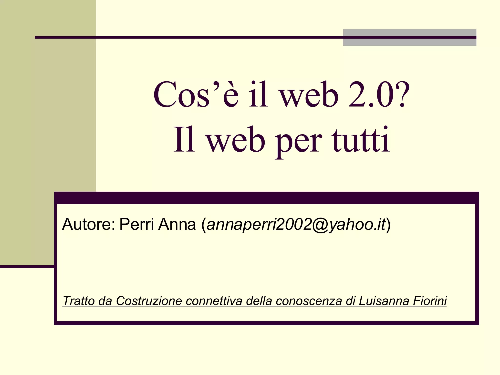 Il documento esplora il concetto di Web 2.0, evidenziando la transizione da un web statico a uno interattivo, dove gli utenti non sono solo consumatori di contenuti ma anche creatori di conoscenza. Vengono presentati strumenti fondamentali come i wiki e i blog, che facilitano la collaborazione e la condivisione delle informazioni. Il wiki permette una gestione collettiva della conoscenza, mentre il blog offre una piattaforma per espressione personale e interazione sociale.