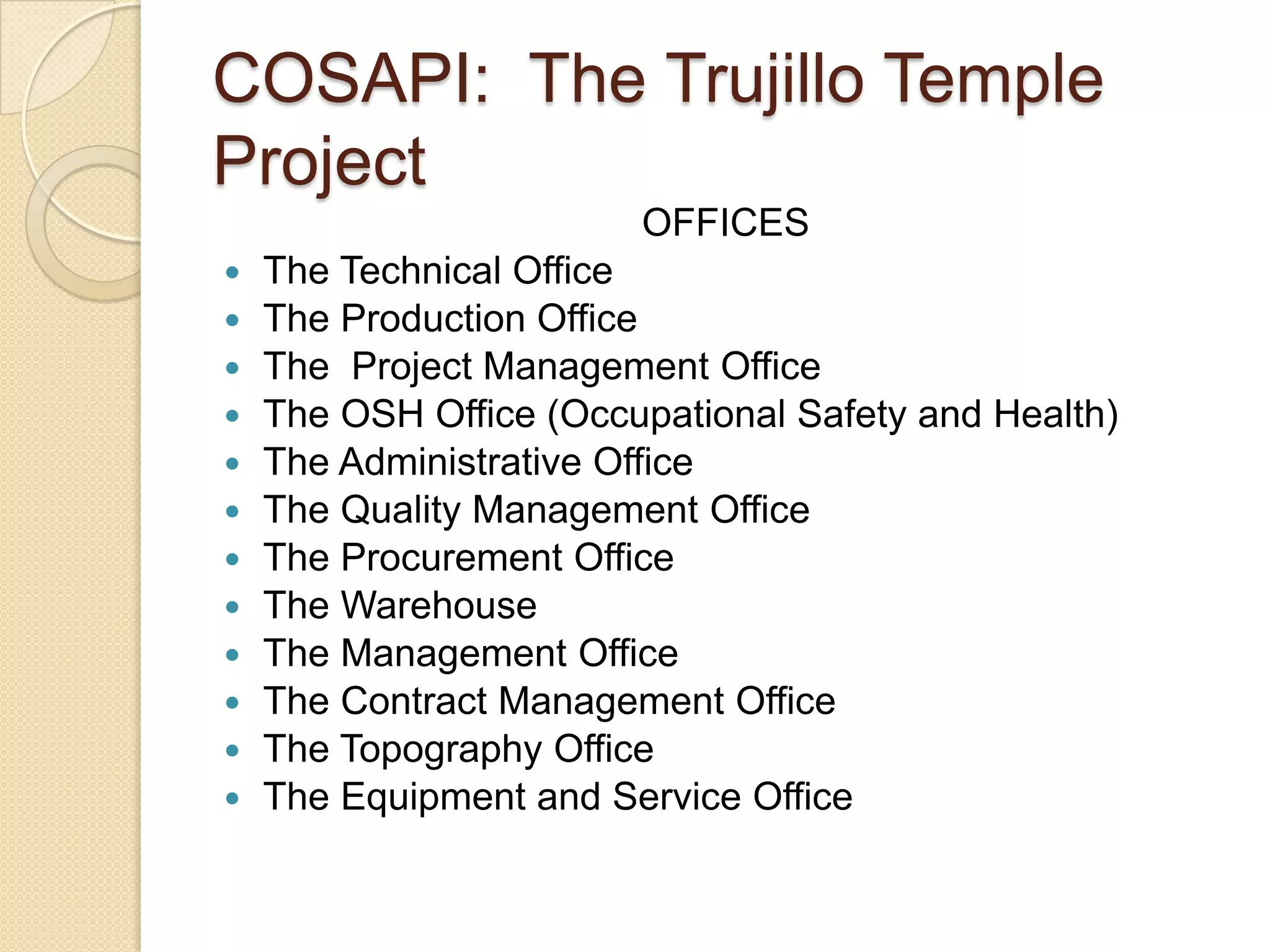The document outlines the offices that make up the COSAPI project to build the Trujillo Temple Project in Peru, including the Technical Office, Production Office, Project Management Office, and others. It then provides sample introductions and conversations between project staff. Finally, it gives an overview of the scope of work for the project, which includes constructing the Temple, housing, and auxiliary buildings that integrate with the site's landscaping.