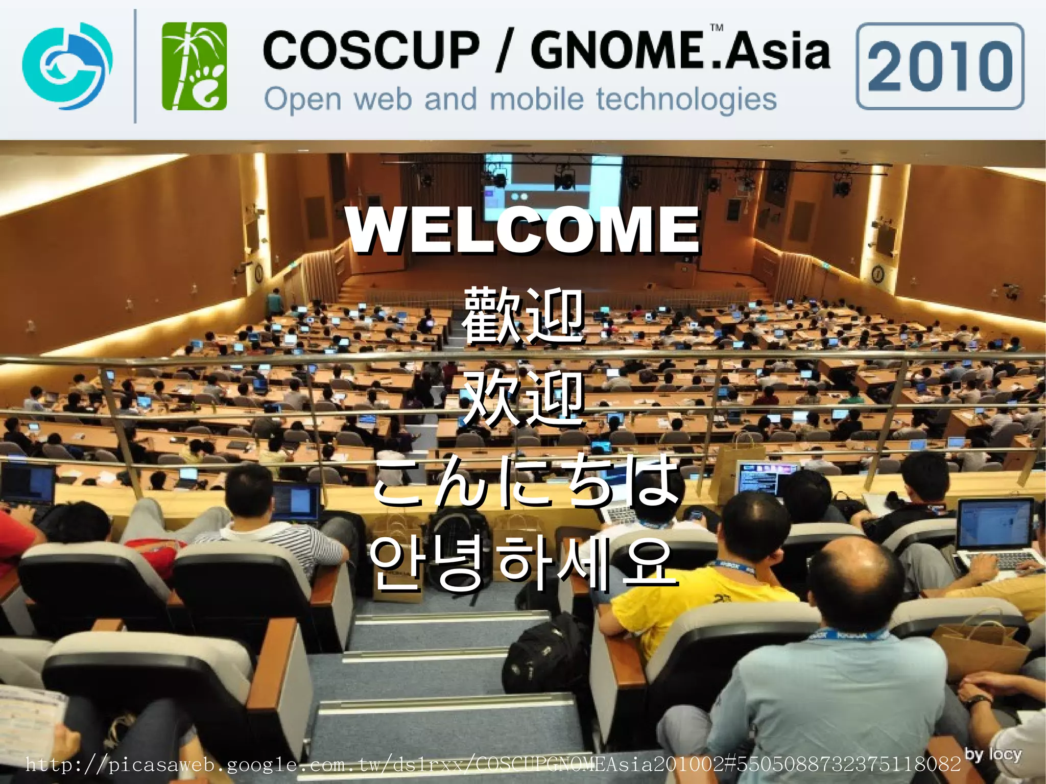 This document provides welcoming messages in multiple languages and information for attendees of an event including instructions to check in daily for a lunch coupon, where to get vegetarian lunch, recycling garbage, following event staff, using event hashtags on social media, checking the event wiki for IRC information, rules for the conference room including turning off phones and no food/drink or smoking, notices about bandwidth usage and not hacking event routers, instructions to turn off personal WiFi when connected via wired connection, and notices about items for sale and shuttle bus transportation after the event.