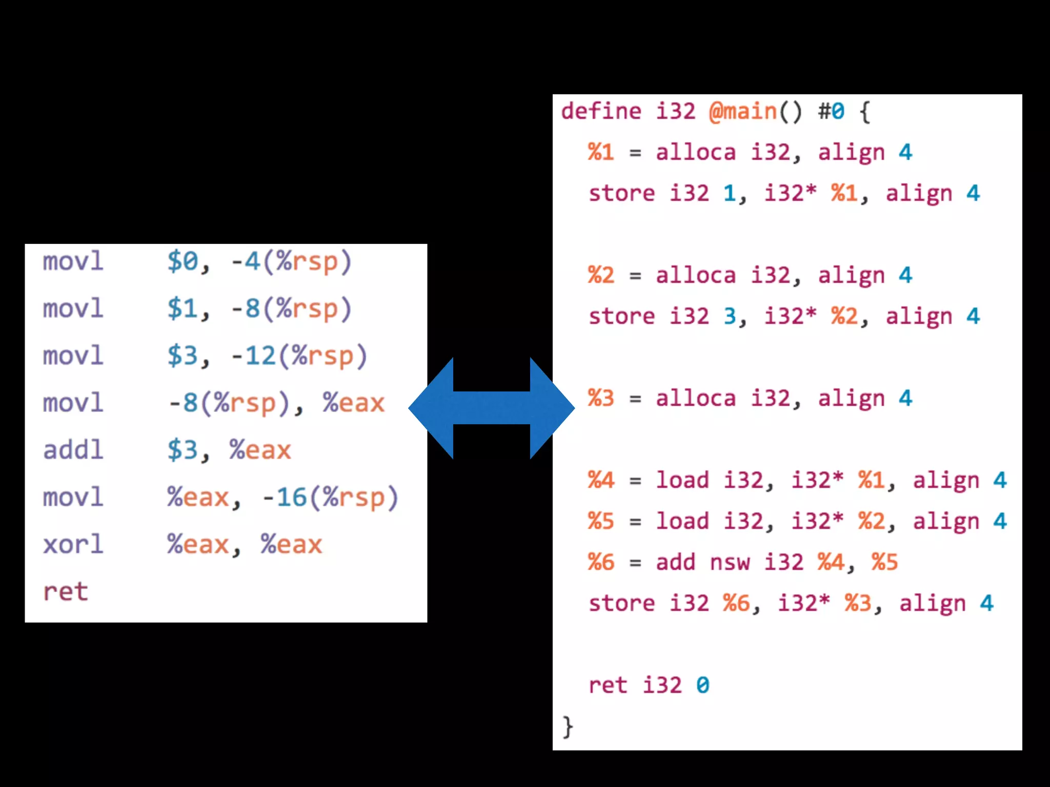 (Reduced Instruction Set Computing) • ⼈人類可讀的 • 具備 SSA form (Static Single Assignment) • 無限多的虛擬暫存器 • 任意位元⼤大⼩小 • 不改變⾏行為下 Transform IR ,來做最佳化。
