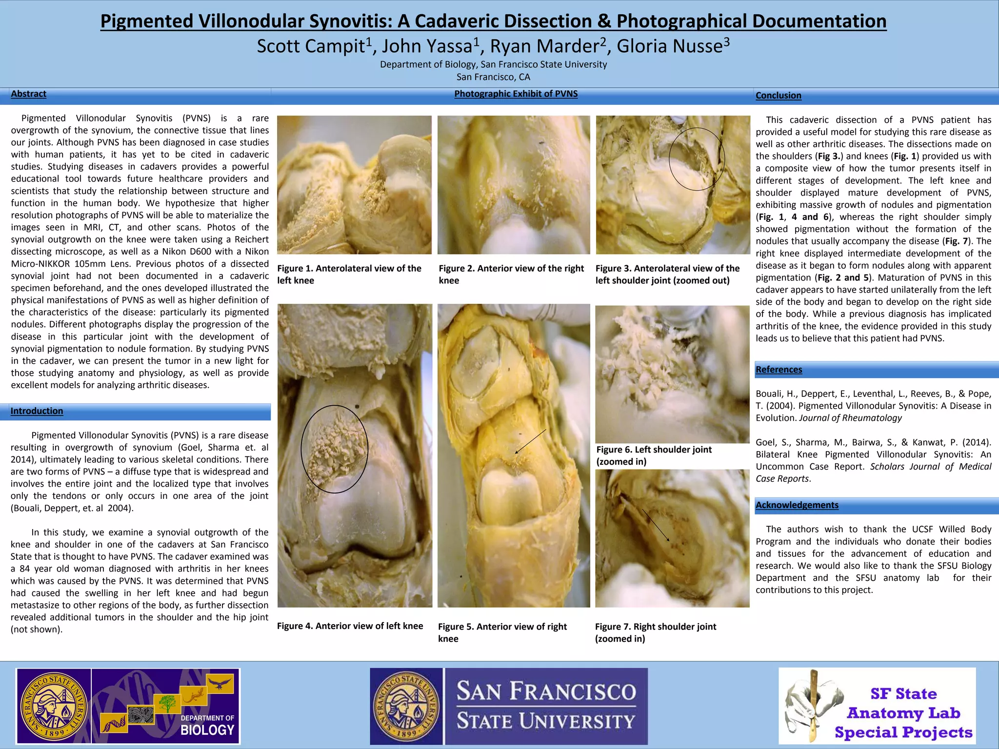This document summarizes a study of Pigmented Villonodular Synovitis (PVNS) found in a cadaver. PVNS is a rare overgrowth of the synovium that lines joints. The researchers dissected the knees and shoulders of a cadaver that had been previously diagnosed with arthritis. They found evidence of PVNS, including pigmented nodules. Photos were taken to document the progression of PVNS from early pigmentation to mature nodule formation. Studying PVNS in cadavers provides useful models for understanding arthritic diseases.
