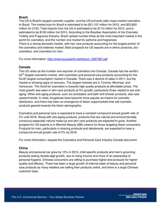 This document provides summaries of the cosmetics and toiletries market for various countries. Each country summary includes information on the estimated market size, import statistics from the US, best selling product categories, and opportunities for US exports. The markets range in size from $1.9 billion in Argentina to $21.1 billion in Brazil. Across countries, common opportunities for US suppliers include skin care products, hair care, fragrances, anti-aging products, and natural/organic cosmetics.