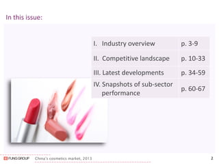 China's cosmetics market grew 13.3% in 2013, a slower rate than the previous year. Skin care and hair care products make up over half of sales. Department stores and hypermarkets were previously major sales channels but are declining, while health/beauty stores and online retailing are growing. Foreign brands still dominate the market, with L'Oreal, P&G and Shiseido comprising over 30% of sales. Some foreign brands are exiting China to focus on core brands.