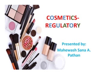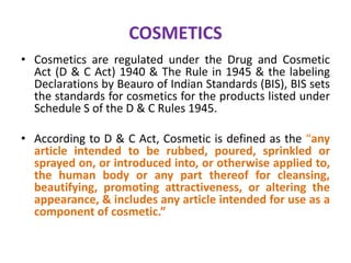 The document provides an overview of cosmetics regulation under the Drug and Cosmetic Act, 1940 in India, detailing the process for obtaining manufacturing licenses, categorizing cosmetics, and establishing quality standards. It outlines the requirements for production facilities, labeling, and testing of cosmetics, as well as penalties for violations, including the import and sale of unsafe or misbranded products. Additionally, it mentions provisions for loan licensing and lists prohibited cosmetics to ensure consumer safety.