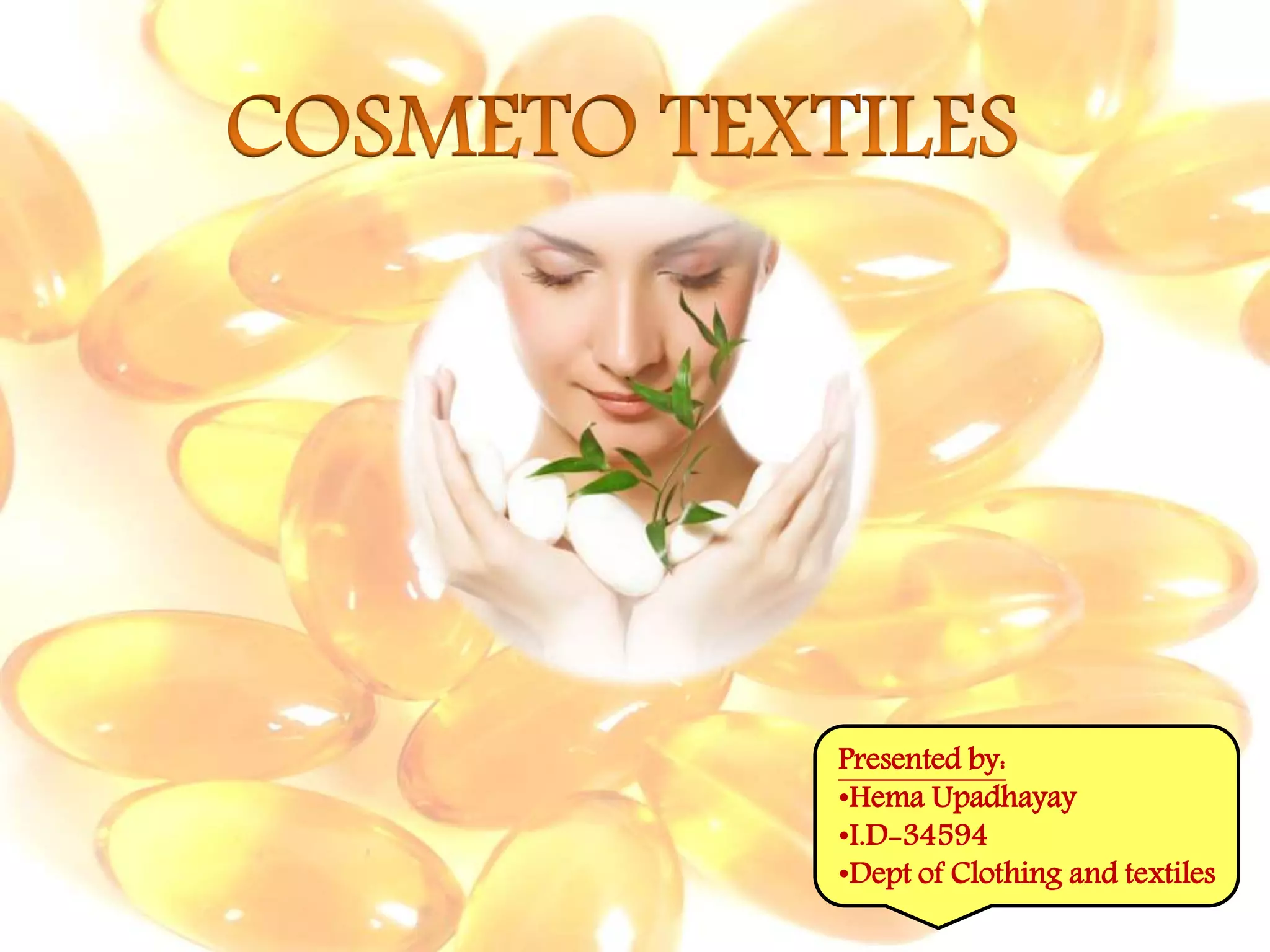 Hema Upadhayay presented on the concept of cosmetotextiles. Cosmetotextiles are textile articles that contain substances or preparations released over time on the skin with special functionalities like cleansing, perfuming, or protecting the skin. They discussed various agents used in cosmetotextiles like moisturizing agents, sun protection agents, aromas and perfumes. Technologies used include microencapsulation, nanotechnology, and smart textiles with phase change materials. Commonly used ingredients are natural herbs, plants, oils as well as synthetic compounds. Finishing techniques to apply these ingredients include coating, grafting, dyeing and use of new fibers. Some commercial products featuring anti-cellulite