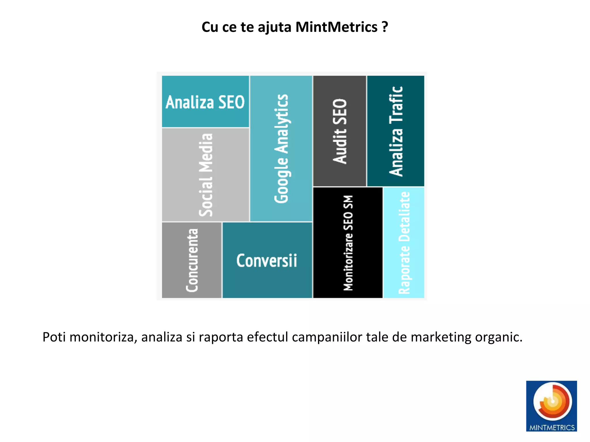 Mintmetrics este un instrument care permite monitorizarea, analiza și raportarea campaniilor de marketing organic. Acesta oferă informații utile din Google Analytics, ajutând utilizatorii să analizeze performanța cuvintelor cheie și impactul social media asupra site-ului. Instrumentul include audit SEO la nivel de landing page și acces gratuit pentru un număr limitat de utilizatori.
