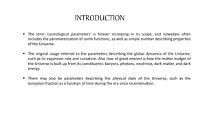 This document summarizes cosmological parameters measured from galaxy surveys. It discusses: