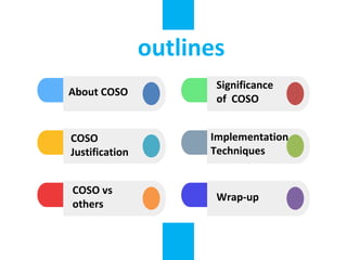 The document outlines the implementation of the COSO framework at CoopBank, detailing its significance in enhancing organizational performance and governance, as well as its focus on fraud deterrence. It discusses the evolution of COSO from its inception to the present, emphasizing the need for adaptation to new challenges such as cybersecurity and globalization. The document also includes strategies for aligning COSO principles with CoopBank's growth strategy and risk management processes.
