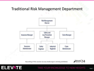 The document discusses key concepts in enterprise risk management (ERM) including ERM frameworks and processes, risk identification tools, risk assessment techniques like risk mapping and decision trees, and risk management concepts such as risk centers, owners, and attitude. It provides definitions and descriptions of risk management approaches and illustrates examples to explain various risk analysis models and metrics.
