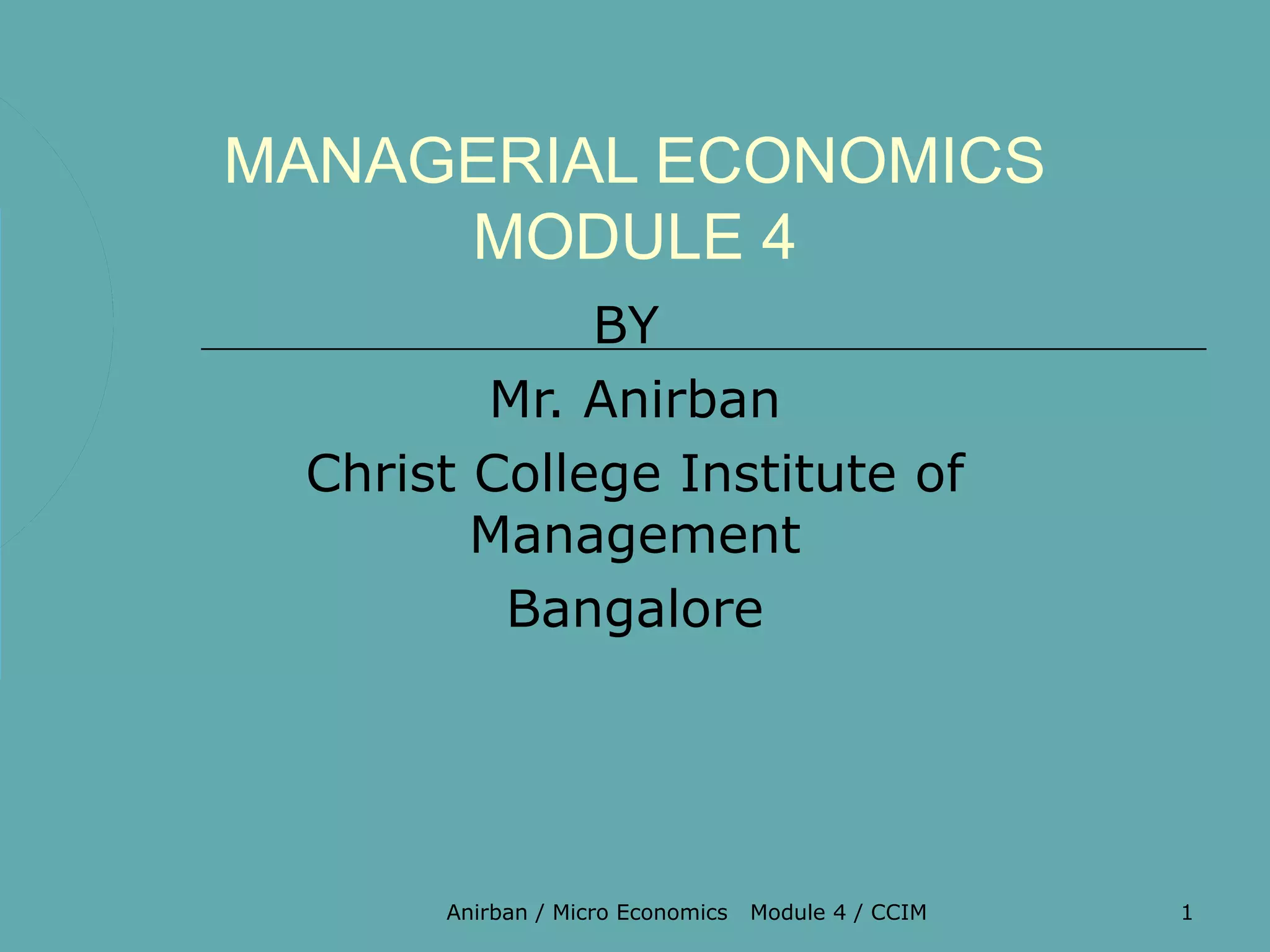This document is a module on cost analysis from Mr. Anirban of Christ College Institute of Management in Bangalore. It covers various cost concepts including actual and opportunity costs, fixed and variable costs, as well as cost curves like total, average, and marginal costs. Examples are provided to illustrate break-even analysis and the calculation of costs at different output levels. The module aims to explain traditional cost theory and how costs are measured in managerial economics.