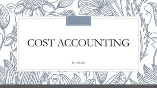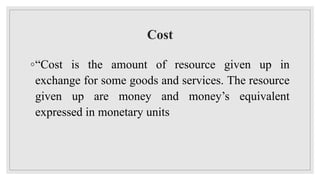 Cost accounting involves recording, classifying, and summarizing costs to determine the costs of products, services, or activities. It provides information to management for decision making, cost control, and reducing costs. Cost accounting determines unit costs by categorizing costs as direct materials, direct labor, and expenses. It helps identify profitable and unprofitable activities. Financial accounting only provides overall performance and is historical in nature, while cost accounting provides more detailed cost information and analysis to management.