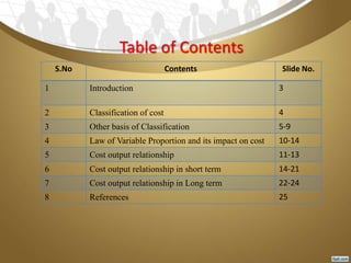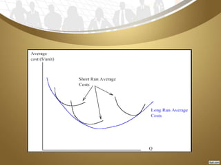 Cost analysis refers to studying how costs change with production levels and other economic factors. Costs are classified as explicit or implicit, and by their behavior as fixed, variable, or semi-variable. In the short run, average and marginal costs decrease initially as output rises due to efficiencies, but average costs eventually increase due to diminishing returns. In the long run, all factors are variable and average costs decrease with larger scale until an optimal size is reached.