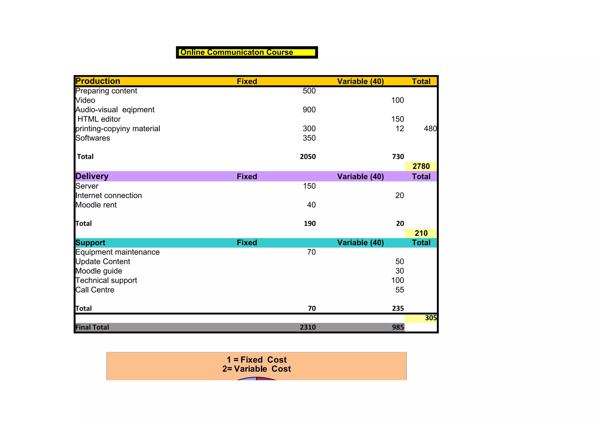 This document summarizes the costs for an online communication course including production, delivery, and support. Production costs are $2,050 in fixed costs and $730 in variable costs. Delivery costs are $190 in fixed costs and $20 in variable costs. Support costs are $70 in fixed costs and $235 in variable costs. The total costs are $2,310 in fixed costs and $985 in variable costs.