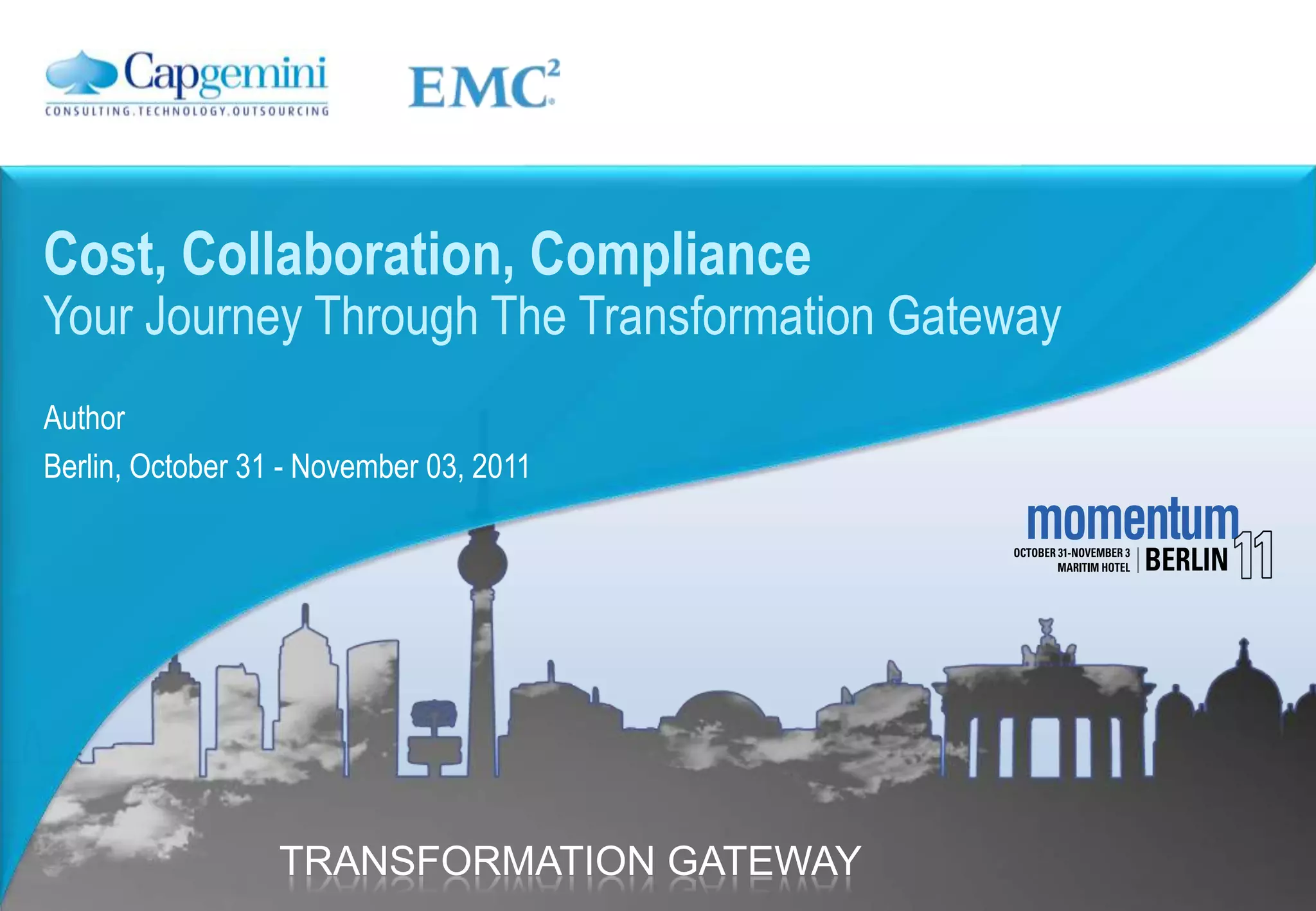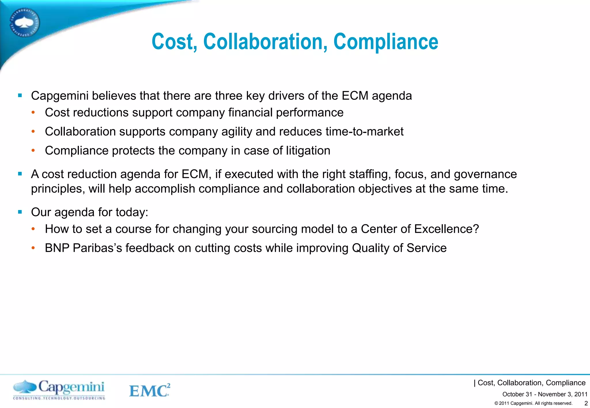 The document discusses Capgemini's Transformation Gateway conference focused on cost, collaboration, and compliance in enterprise content management (ECM). It notes that properly executed ECM cost reduction agendas can help achieve compliance and collaboration objectives. The agenda covers how to establish a center of excellence and BNP Paribas's feedback on cutting costs while improving quality of service. Virtualization is presented as a way to increase flexibility for document management while realizing savings.