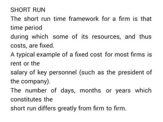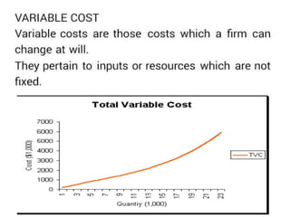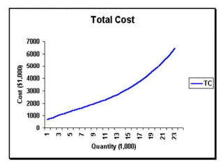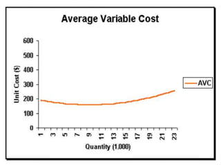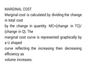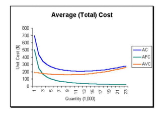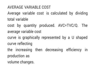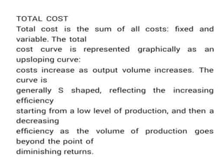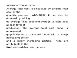 The document discusses various cost curves, including the average cost (AC), average variable cost (AVC), and marginal cost (MC) curves, highlighting their shapes and relationships. AC and AVC are 'U' shaped, with AC starting to rise after reaching its minimum point, which coincides with MC at this point. Additionally, it notes that while AVC is positively sloped and can never touch AC, MC intersects both curves at their minimums and rises and falls at different rates.