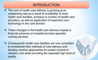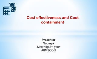 The document discusses the rising costs of healthcare delivery and the need for healthcare facilities to contain costs while maintaining quality. It defines different types of costs like direct, indirect, fixed, variable and sunk costs. It also summarizes the different levels of cost hierarchy, theories of cost inflation, principles of efficiency, stages of cost effectiveness and containment, and types of economic evaluation.