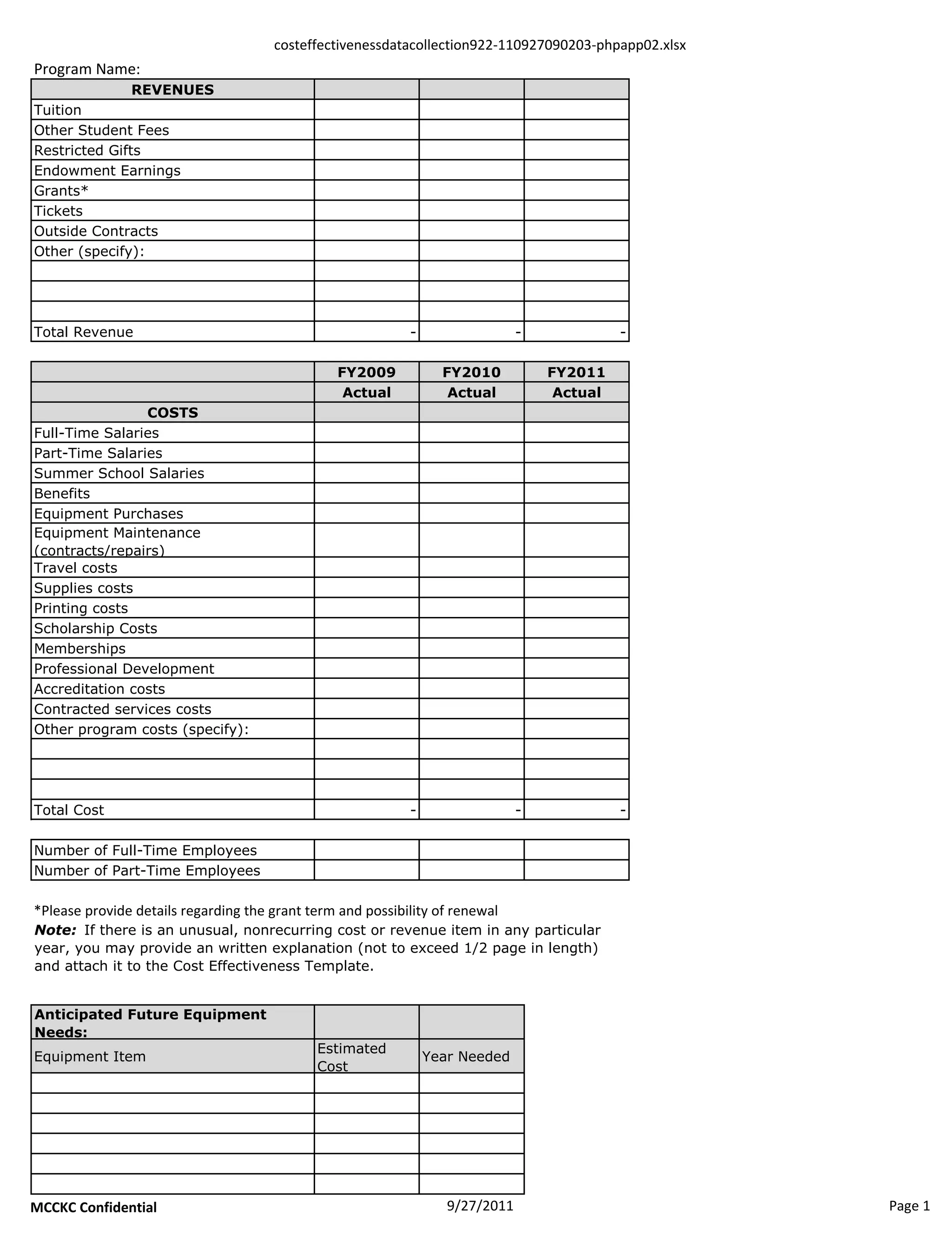 This document is a cost effectiveness template for a program that tracks revenues and costs over three fiscal years (FY2009 to FY2011). It collects information on revenue sources like tuition, fees, gifts, and grants, as well as expenses categories including salaries, benefits, supplies, equipment, and other program costs. The template also requests details on grants and anticipated future equipment needs and their estimated costs.