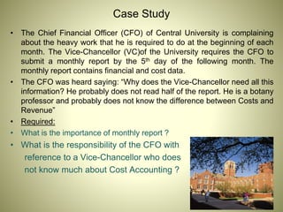 The monthly report submitted by the CFO to the VC contains important financial and cost data that allows the VC to monitor spending trends, analyze costs, and find ways to reduce expenditures. While the VC may not have an accounting background, understanding basic financial concepts would help him better manage the university. It is the CFO's responsibility to clearly present the monthly financial statements and educate the VC on finance and accounting topics so important decisions can be made.