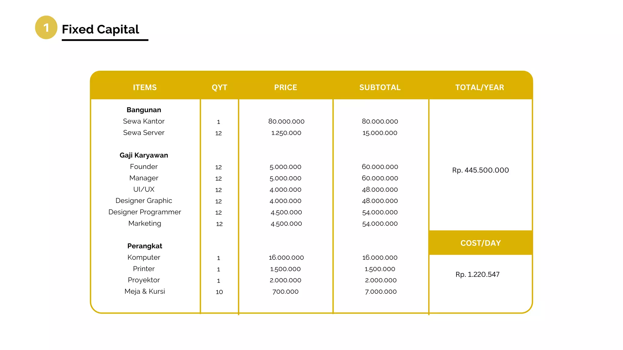 Dokumen menyajikan struktur biaya untuk studio desain grafis, termasuk biaya sewa, gaji, dan peralatan, serta strategi bisnis untuk e-commerce Toeco Maricle yang fokus pada produk daur ulang. Visi dan misi Toeco Maricle adalah memberdayakan UMKM dan menciptakan kesadaran lingkungan di masyarakat Indonesia, dengan target demografis yang beragam. Brand ambassador yang dipilih adalah Tasya Kamila, yang memiliki latar belakang kuat dalam lingkungan.