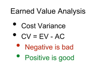 The document provides an overview of earned value analysis (EVA), detailing cost variance (CV) calculations where a negative CV indicates poor performance. It includes a time-phased budget for tasks associated with a project, outlining planned value (PV), actual cost (AC), and earned value (EV) over six weeks. As of week three, the project has a CV of -$933, indicating costs exceed budgeted values despite 50% completion of work.