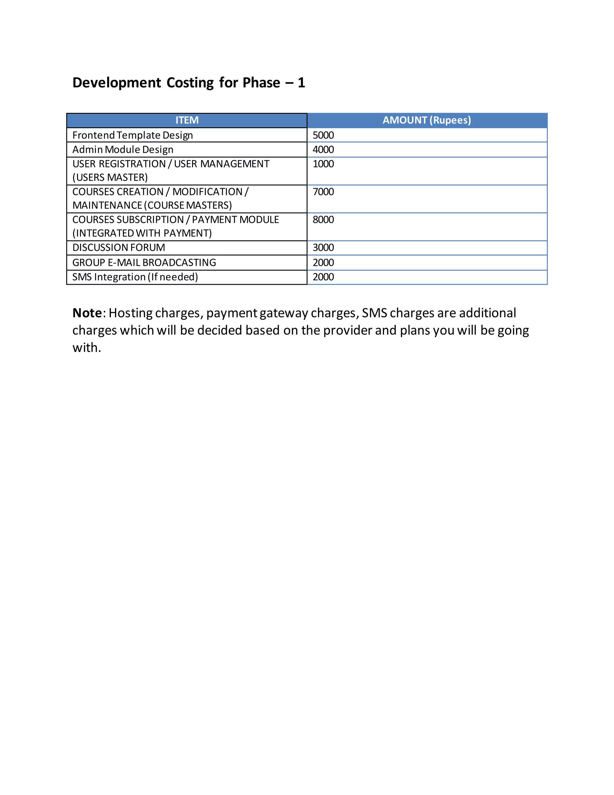 The document provides a cost breakdown for the development of phase 1 of a project. It estimates costs of Rs. 5000 for frontend template design, Rs. 4000 for admin module design, and Rs. 1000 for user registration and management. Developing courses creation, modification and maintenance functionality is estimated to cost Rs. 7000, and integrating a course subscription and payment module is Rs. 8000. Additional costs include Rs. 3000 for a discussion forum, Rs. 2000 for group email broadcasting, and Rs. 2000 for SMS integration if needed.
