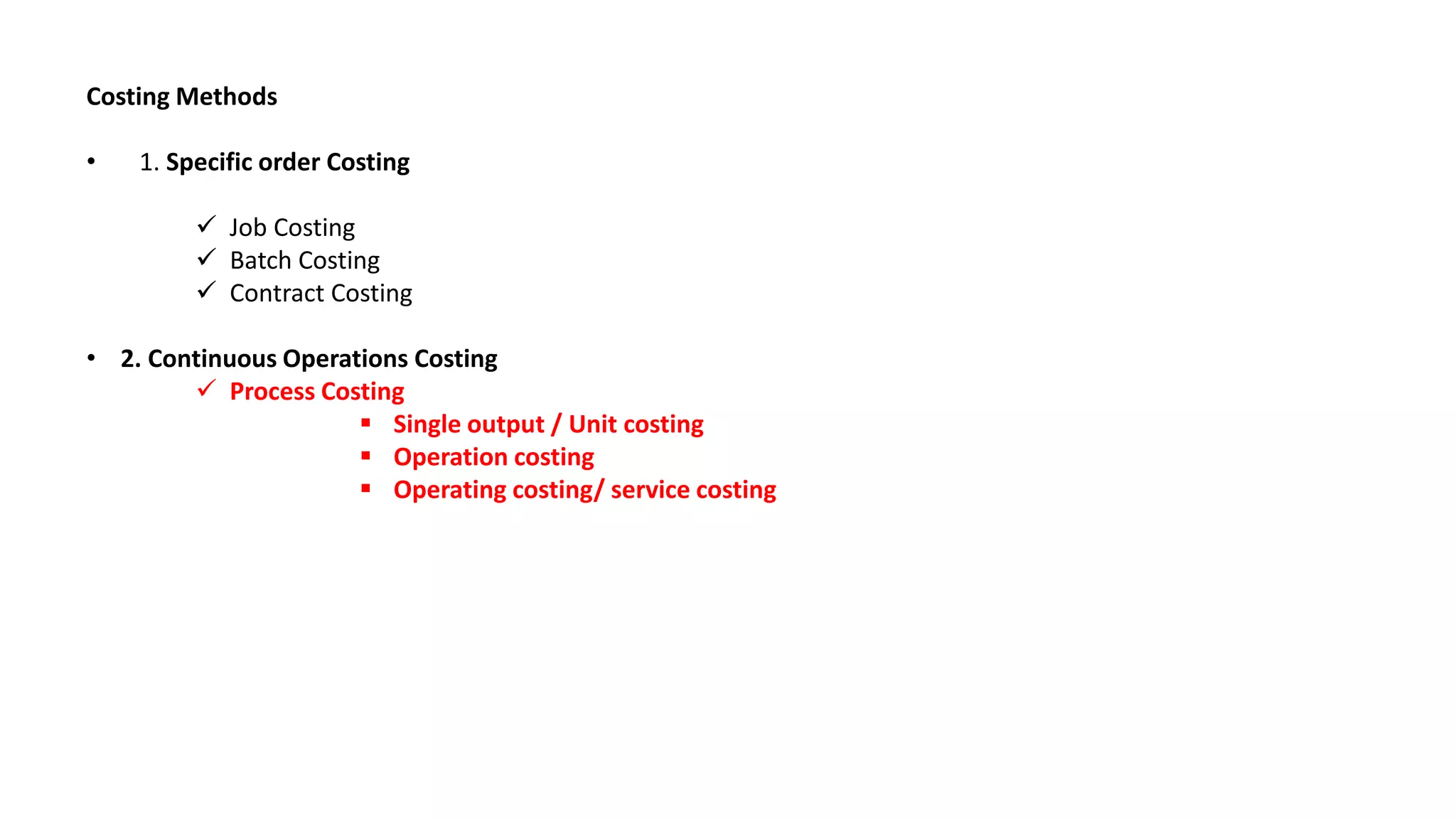 This document discusses different costing methods used in accounting. It outlines specific order costing methods like job, batch, and contract costing. It also discusses continuous operations costing methods like process costing which can be single output, operation, or operating costing. Process costing is preferred for mass production industries that have continuous operations and uniform standard products like textiles, chemicals, paper, sugar, oil, cement, mining, and paints & varnish.