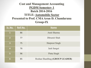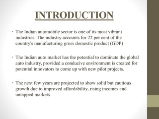 The document discusses the Indian automobile sector's significance, revealing its contribution of 22% to the country's manufacturing GDP. It highlights substantial growth in vehicle production and sales, particularly in the two-wheeler segment, along with substantial foreign direct investment. Key players, market trends, product variety, cost structures, and government regulations are also examined, indicating a cautiously optimistic outlook for the industry's future.