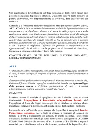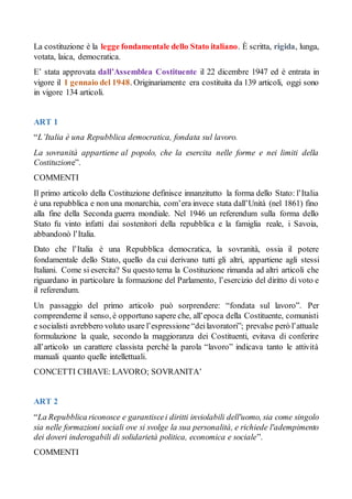 La Costituzione italiana, approvata nel 1947 e in vigore dal 1948, stabilisce i principi fondamentali dello Stato italiano, inclusa la sua forma di repubblica democratica. Essa garantisce diritti inviolabili e l'uguaglianza di tutti i cittadini, definendo la sovranità popolare, l'autonomia locale, e il rispetto dei diritti umani, della legalità e della dignità. Elementi chiave includono la libertà di espressione, la responsabilità penale personale, e il rifiuto della pena di morte.