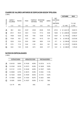 This document contains two tables. The first table lists unit costs in Soles and dollars for various construction elements (walls, floors, etc.) according to building typology from A to G. It also provides the total unit cost per square meter for each typology. The second table shows the cost ratios for specialties (structures, architecture, installations) for each typology, with typology A having the highest costs and typology G the lowest. On average, structures make up 40% of costs, architecture 45%, and installations 15%.