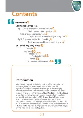 1. It outlines 6 tips for customer service, including creating a customer-focused culture, listening to customers, engaging employees, showing customers you care, benchmarking service, and continuously improving.