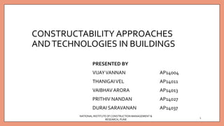 This document discusses various constructability approaches and technologies used in buildings. It defines constructability as reviewing construction processes during design to reduce errors and costs. Barriers to improving constructability include lack of communication between designers and builders. New materials and technologies discussed include drywall construction, aluminum formwork, autoclaved aerated concrete blocks, PU sealants for waterproofing, and using expansive mortars for hard rock excavation. The document provides details on the application and benefits of these various approaches and technologies.