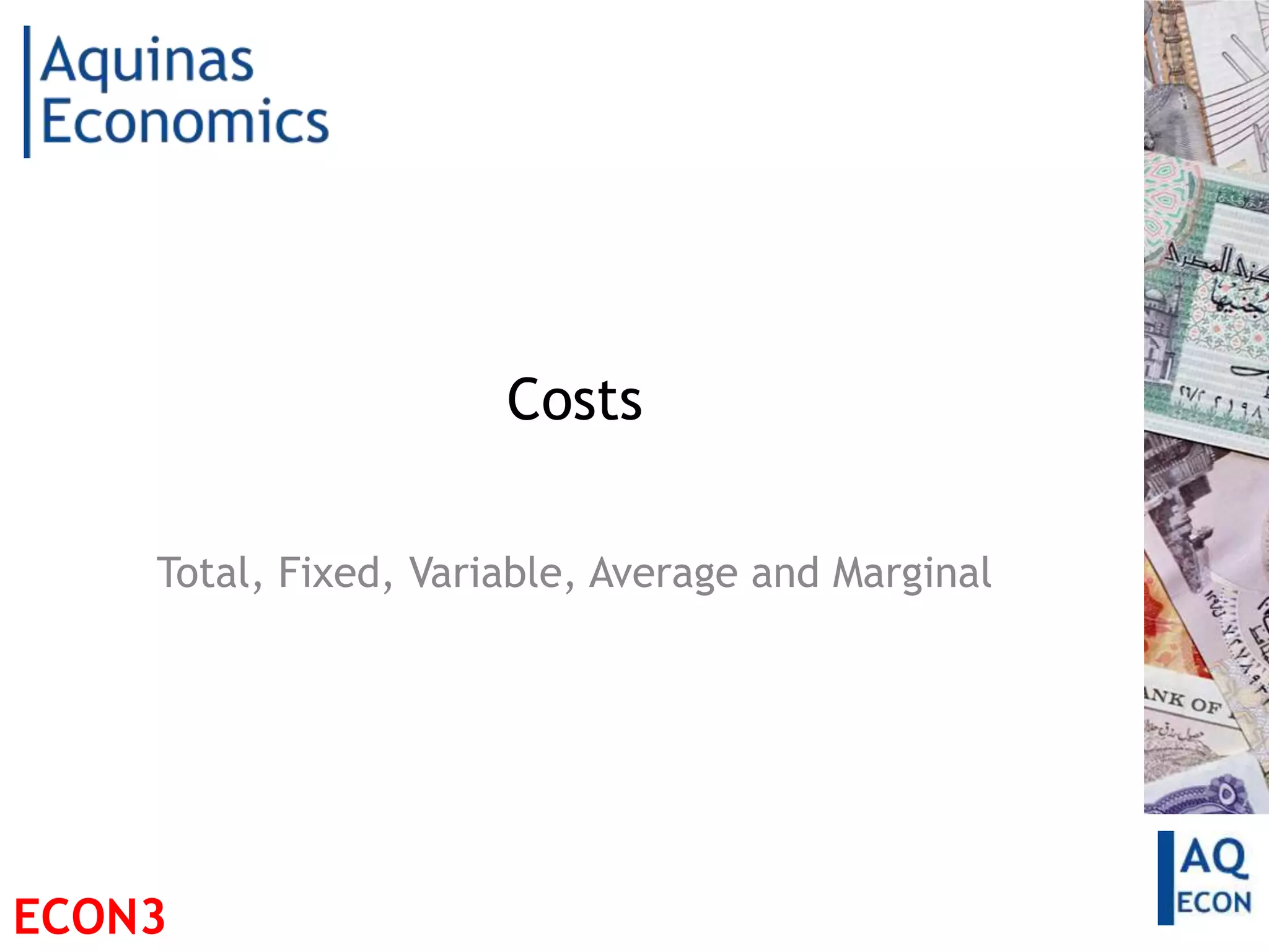 This document defines and explains different types of costs including fixed costs, variable costs, average costs, and marginal costs. It provides examples of fixed costs like rent and salaries. Variable costs vary with output and include raw materials. Average costs are calculated by dividing total costs by units produced. Marginal cost is the change in total cost from producing one additional unit. Cost curves can be used to show the relationship between these different cost measures.