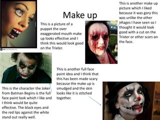 This document discusses costume and makeup ideas for a character called the Trixter. It includes images of exaggerated puppet mouths, gory makeup designs, and full face paint ideas inspired by the Joker from Batman. Straight jackets and a chef's jacket are proposed for the costume. Other costume elements mentioned include old-fashioned slippers, a top hat, and canes. Inspirations discussed are the calculating and menacing personality of the Joker, as well as the mad and bright makeup of the Mad Hatter from Alice in Wonderland. The goal is to portray the mad effects of drugs through the costume and makeup design.
