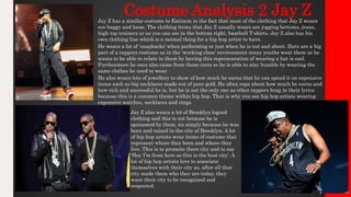 Hip hop fashion is distinctive because it does not require expensive clothing, allowing artists to relate to working class fans. Eminem, Jay-Z, and Kanye West exemplify typical hip hop styles through baggy clothes, hats, and jewelry. While clothes may be cheap, artists spend on tattoos, drugs, and their own clothing lines. Representing where they are from through local logos and staying true to their roots through familiar styles helps artists connect with fans.
