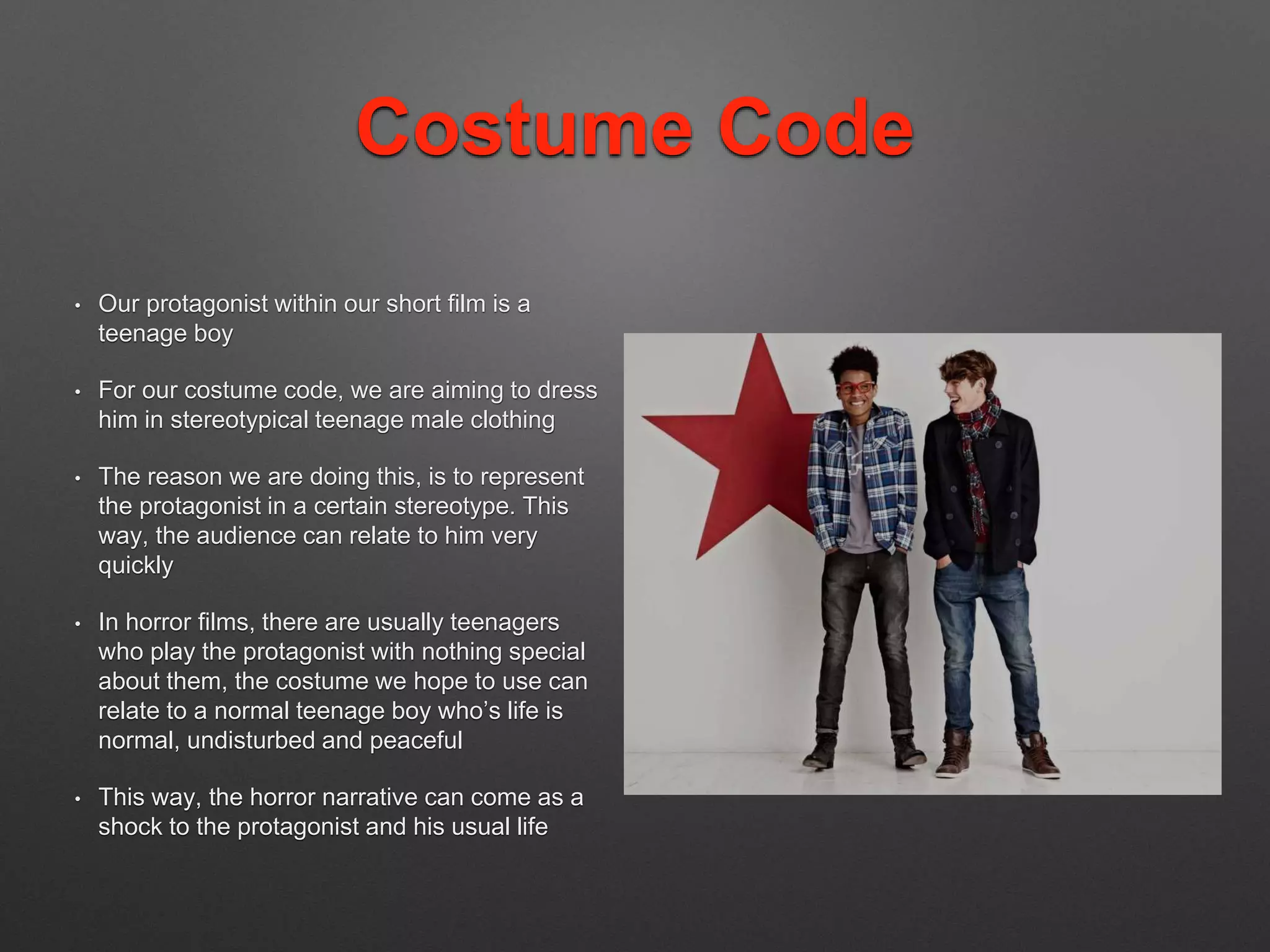 The document outlines the costume code for a teenage boy protagonist in a short film, aiming to dress him in typical teenage male clothing to evoke a relatable stereotype. This choice is meant to quickly connect the audience with the character's normal and peaceful life, making the upcoming horror narrative more shocking. The document emphasizes the importance of representing the protagonist as an ordinary teenager in the context of horror films.
