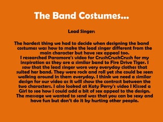 1. The document discusses costume design choices for characters in a music video. For the lead singer, they chose a green top and skinny jeans to contrast with the main character while still looking like part of the band.