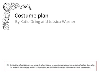 The document outlines costume plans for a music video reflecting pop and rock conventions. It discusses choosing subtle makeup inspired by artists like Pink and Jessie J. Outfits will be fashionable but not revealing, incorporating both dark colors per rock styles seen in Avril Lavigne and bright colors from pop conventions. Hair will be straight but messy, reflecting styles seen in both genres. The plans aim to blend rock and pop elements through clothing, makeup, and hairstyling choices for the performer.